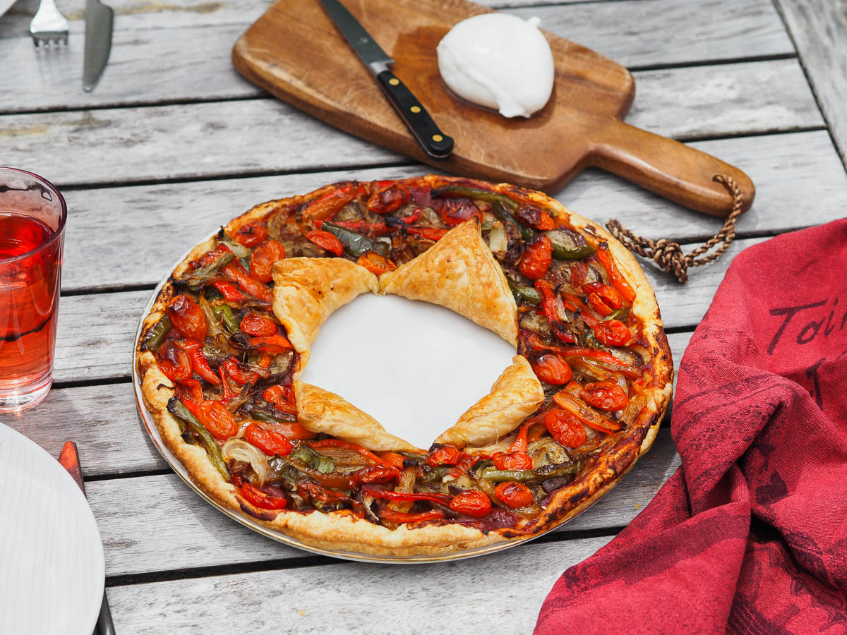 This tart is a bit halfway between the sublime sun tart with its delicious rays and the tomato tart with a mustard base, or my mother’s three pepper tart. It always has a WOW effect even though it is extremely simple to make, a bit like rustic tarts where a few folds and that’s it.