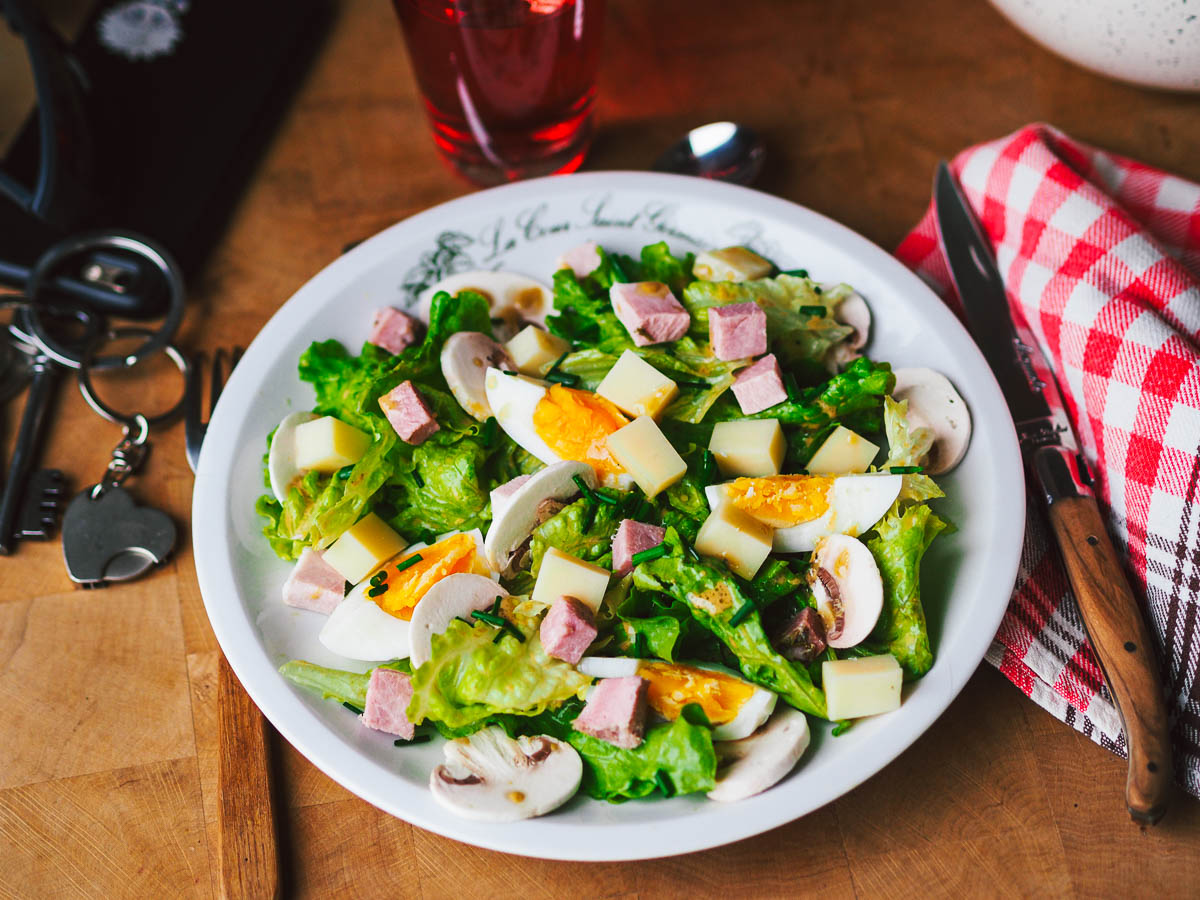 Parisian salad typical of the capital’s brasseries and bistros, a salad composed as you can make it at home with a few ingredients from the Paris region, Paris mushrooms and Paris ham.