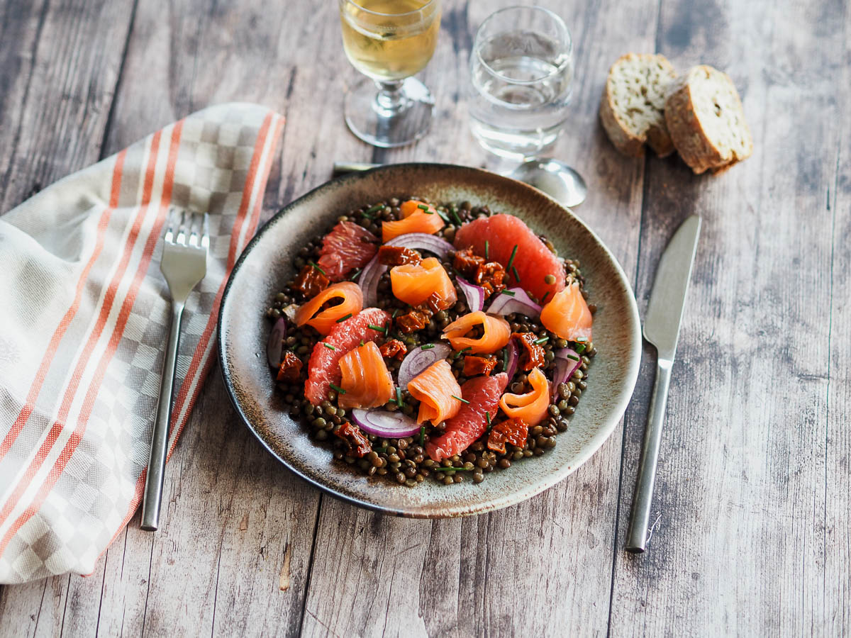 A fresh protein salad with green lentils from Puy AOP with smoked salmon or smoked trout and citrus fruits, grapefruit.
